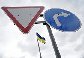 Политическая ситуация в Харькове. Жанровая фотография. Дорожные знаки и флаг Украины.