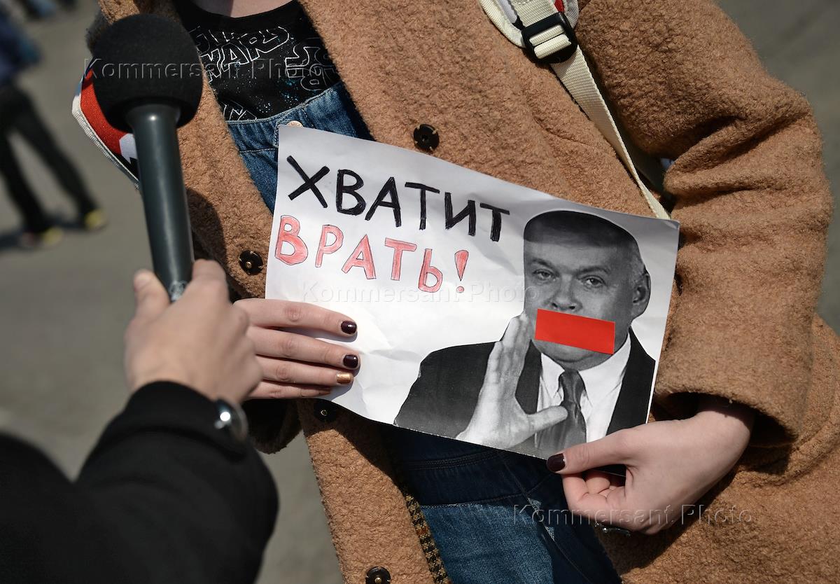 Митинг в защиту свободы слова, организованный по инициативе комитета протестных действий "Марш правды" прошел на проспекте Сахарова. Участник митинга с плакатом "Хватит врать".