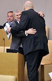 Член комитета Государственной думы (ГД) России по жилищной политике и жилищно-коммунальному хозяйству Борис Михалев (слева) и председатель комитета ГД России по делам национальностей Гаджимет Сафаралиев (в центре) во время пленарного думского заседания.