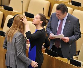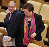 Председатель комитета Государственной думы по вопросам собственности Сергей Гаврилов (слева) и член комитета ГД России по регламенту и организации работы ГД России Валентина Кабанова (справа) на заседании Госдумы.