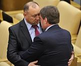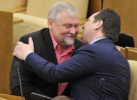 Член комитета Государственной думы (ГД) России по жилищной политике и жилищно-коммунальному хозяйству Борис Михалев (слева) и председатель комитета ГД России по делам национальностей Гаджимет Сафаралиев (в центре) во время пленарного думского заседания.