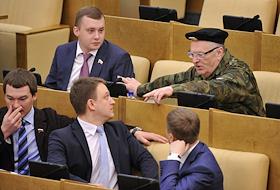 Заместитель председателя комитета Государственной думы (ГД) России по науке и наукоемким технологиям Михаил Дегтярев (слева) и лидер Либерально-демократической партии России (ЛДПР), член комитета ГД России по обороне Владимир Жириновский (справа) на заседании Госдумы.
