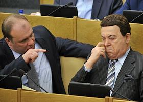 Член комитета Государственной думы (ГД) России по транспорту Андрей Колесник (слева) и первый заместитель председателя Комитета ГД России по культуре Иосиф Кобзон (справа) на заседании Госдумы.