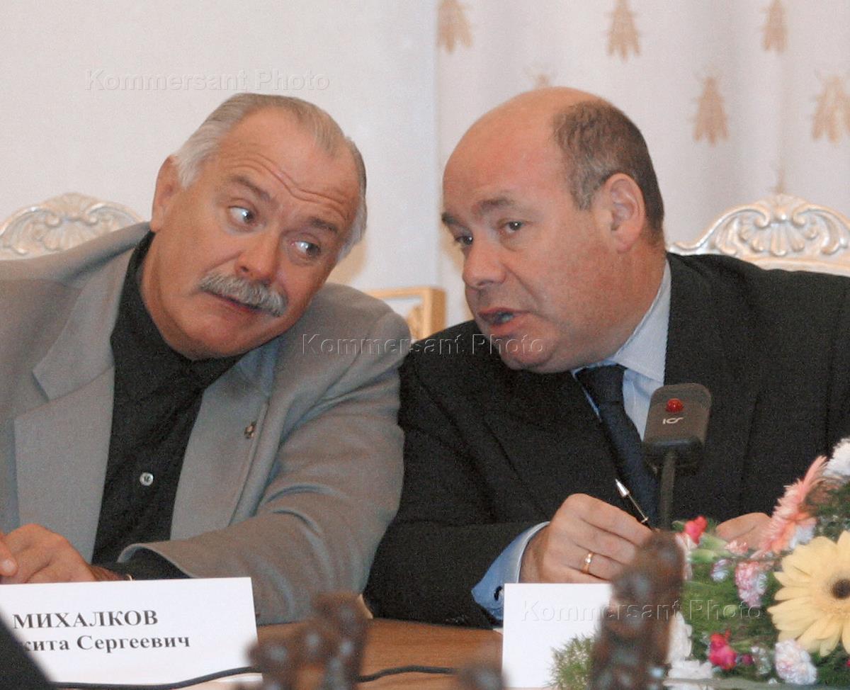 Председатель союза кинематографистов, кинорежиссер Никита Михалков (слева) и министр культуры России Михаил Швыдкой (справа) во время встречи министра иностранных дел (МИД) России Игоря Иванова с советом деятелей культуры, науки и образования при МИД России. Встреча состоялась в здании МИД.