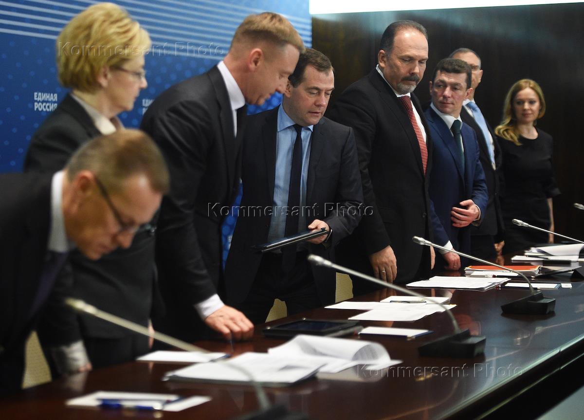 Министр здравоохранения России Вероника Скворцова (вторая слева), министр образования и науки России Дмитрий Ливанов (третий слева), председатель правительства России Дмитрий Медведев (четвертый слева), министр строительства и жилищно-коммунального хозяйства России Михаил Мень (четвертый справа) и министр труда и социальной защиты России Максим Топилин (третий справа) на встрече председателя правительства России Дмитрия Медведева с руководством партии "Единая Россия" (ЕР) и представителями фракции ЕР в Государственной думе России по подготовке ежегодного отчета правительства России. Встреча прошла в здании правительства Москвы.