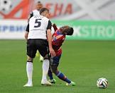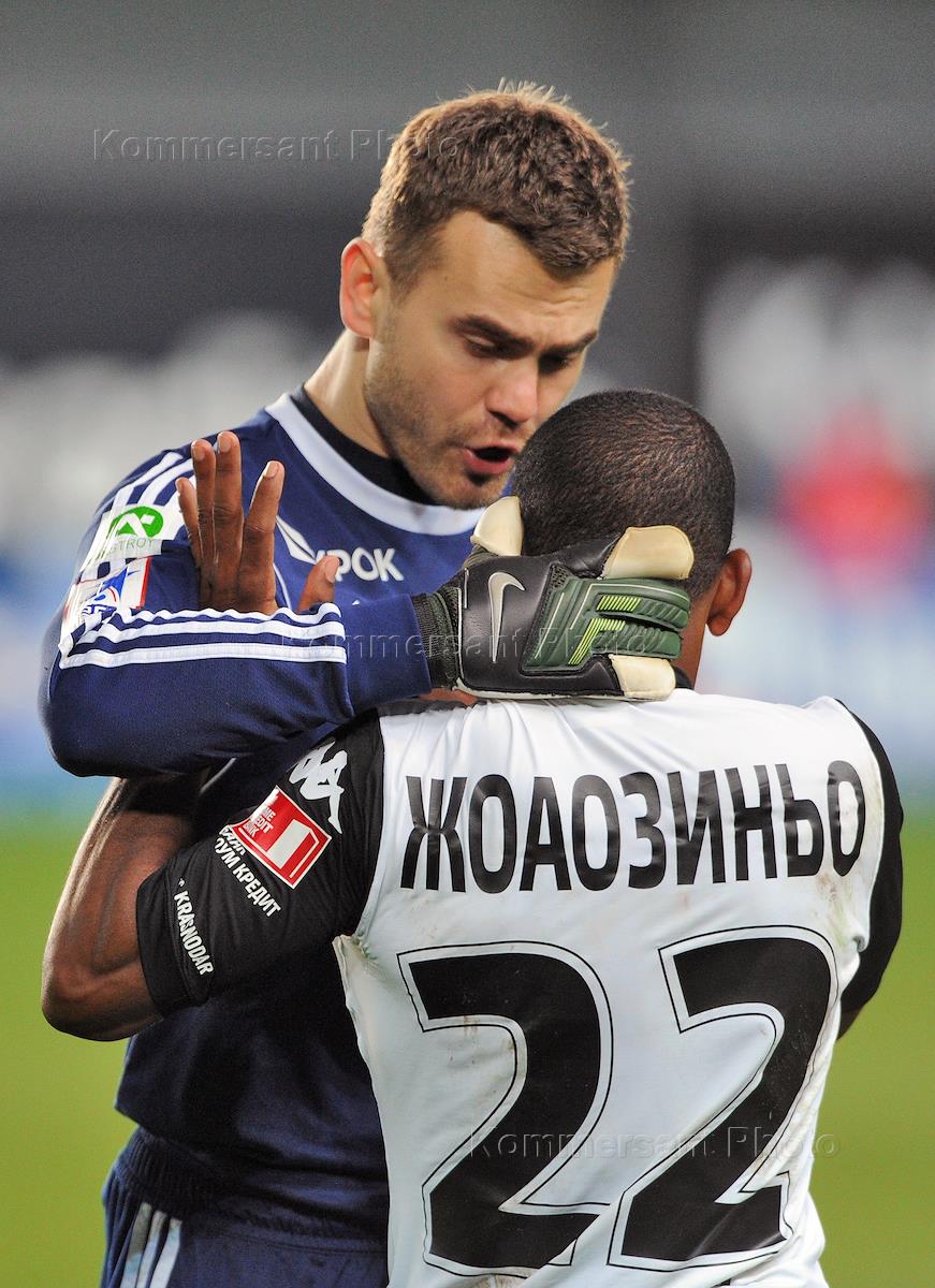 Кубок России по футболу 2013-2014. Полуфинал. Матч между командами "ЦСКА" и "Краснодар" прошел на стадионе "Арена Химки". Вратарь команды "ЦСКА" Игорь Акинфеев (слева) и игрок команды "Краснодар" Жоаозиньо (справа) во время матча.