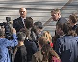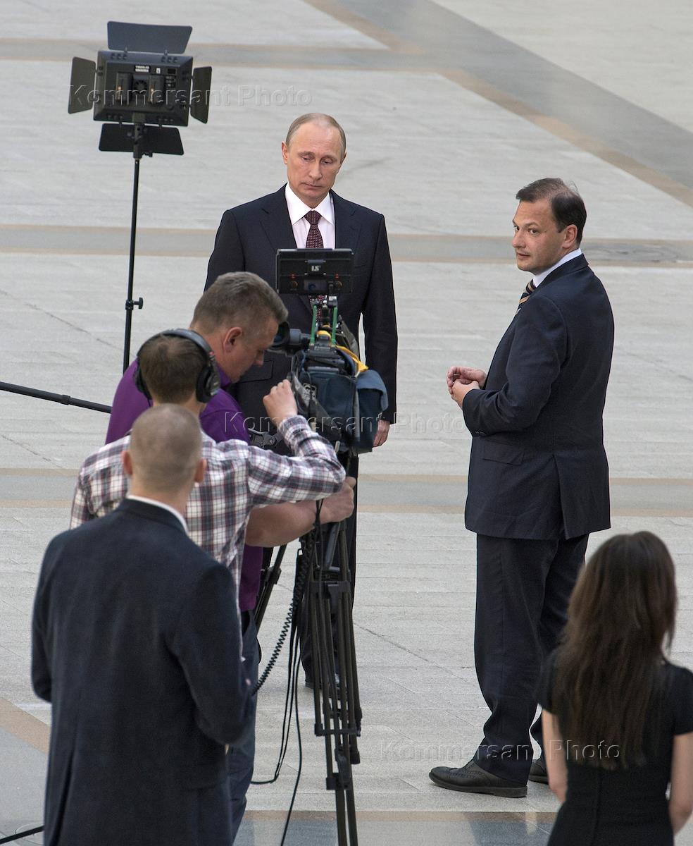 Генеральный директор телекомпании "Первый канал" Константин Эрнст (слева) и президент России Владимир Путин (справа) после проведения "Прямой линии с Владимиром Путиным", в которой президент в 12-й раз ответил на вопросы россиян.