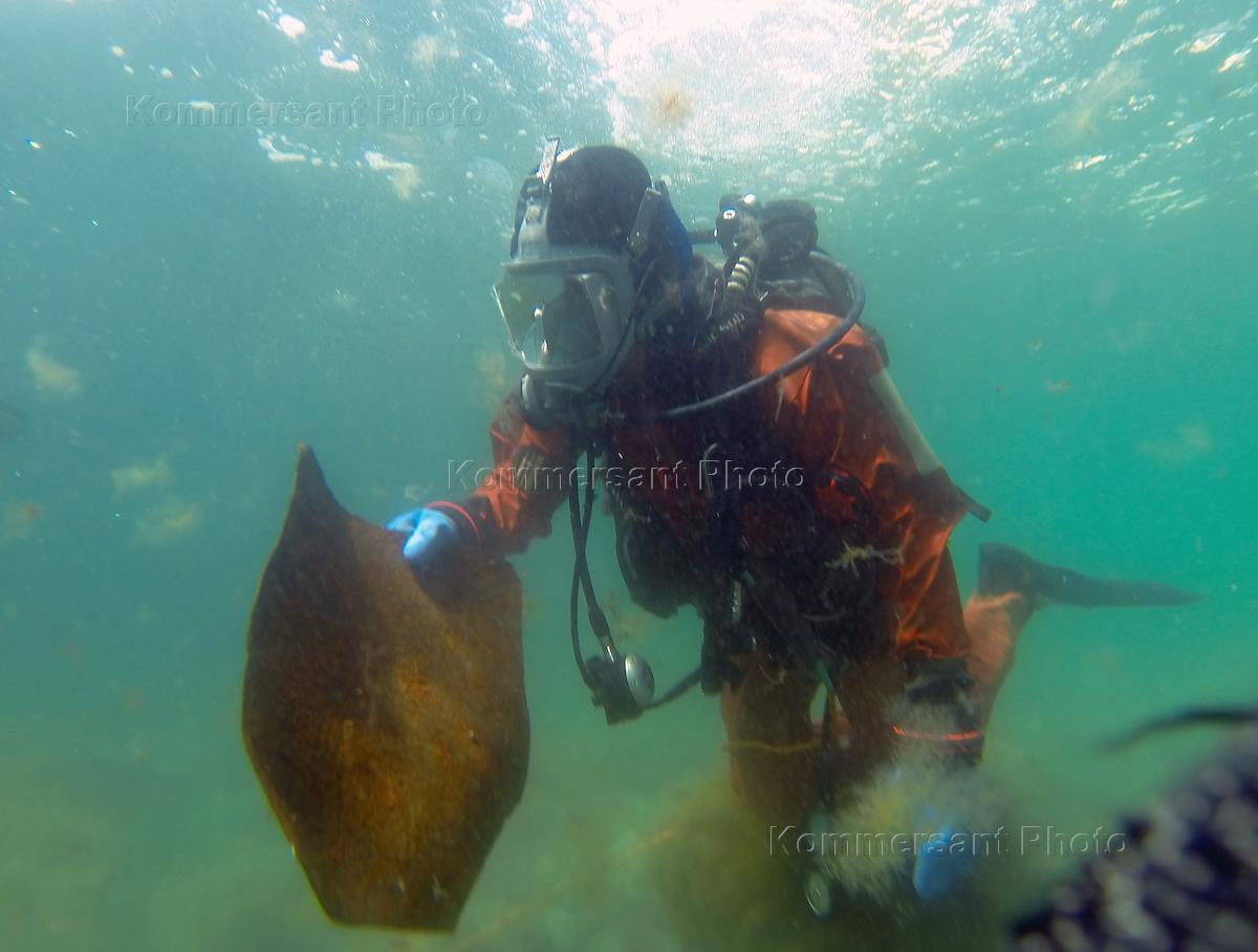 Rescuers of the Ministry of Emergency Situations are during the inspection of littoral sea zone nearby Alushta where people have rest . More than 500 beaches and places, where people have rest, will be inspected by the beginning of the holiday season in Crimea.
