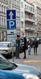 Жанровая фотография. Информационно-указательный дорожный знак "Место для стоянки". Терминал для оплаты парковки.