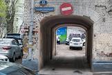 Припаркованные автомобили в Большом Козихинском переулке. Дорожный знак "Въезд запрещен" (кирпич) на арке.