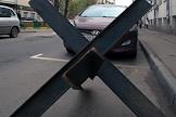 Жанровая фотография. Стоящий у тротуара автомобиль и металлический "еж".
