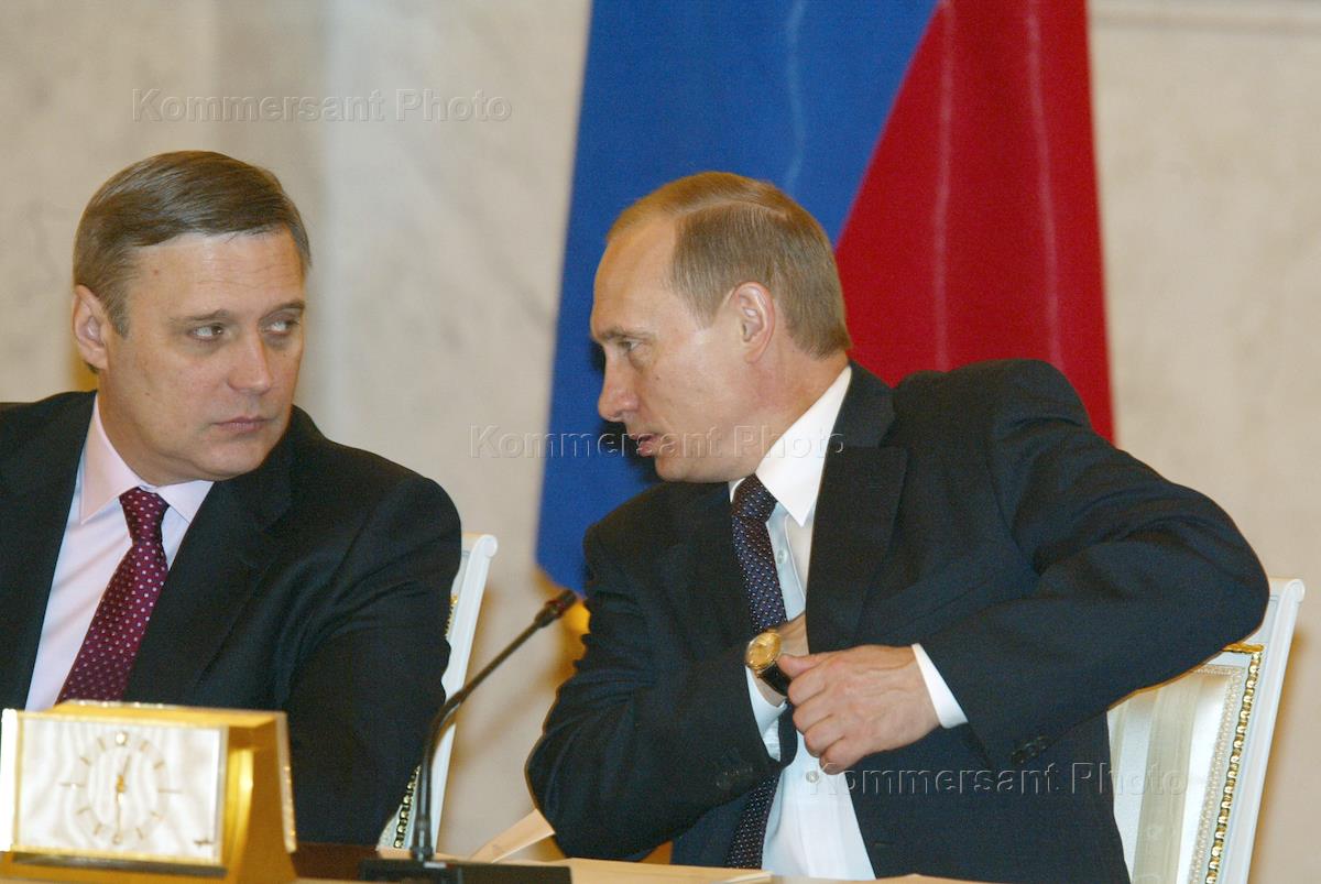 Russian Prime Minister Mikhail Kasyanov (left) and President Vladimir Putin (right) take part in a meeting of the Russian State Council (Gossovet - a consulting body composed of prominent regional leaders and top government officials). The meeting was held in the Kremlin Palace Alexander Hall.