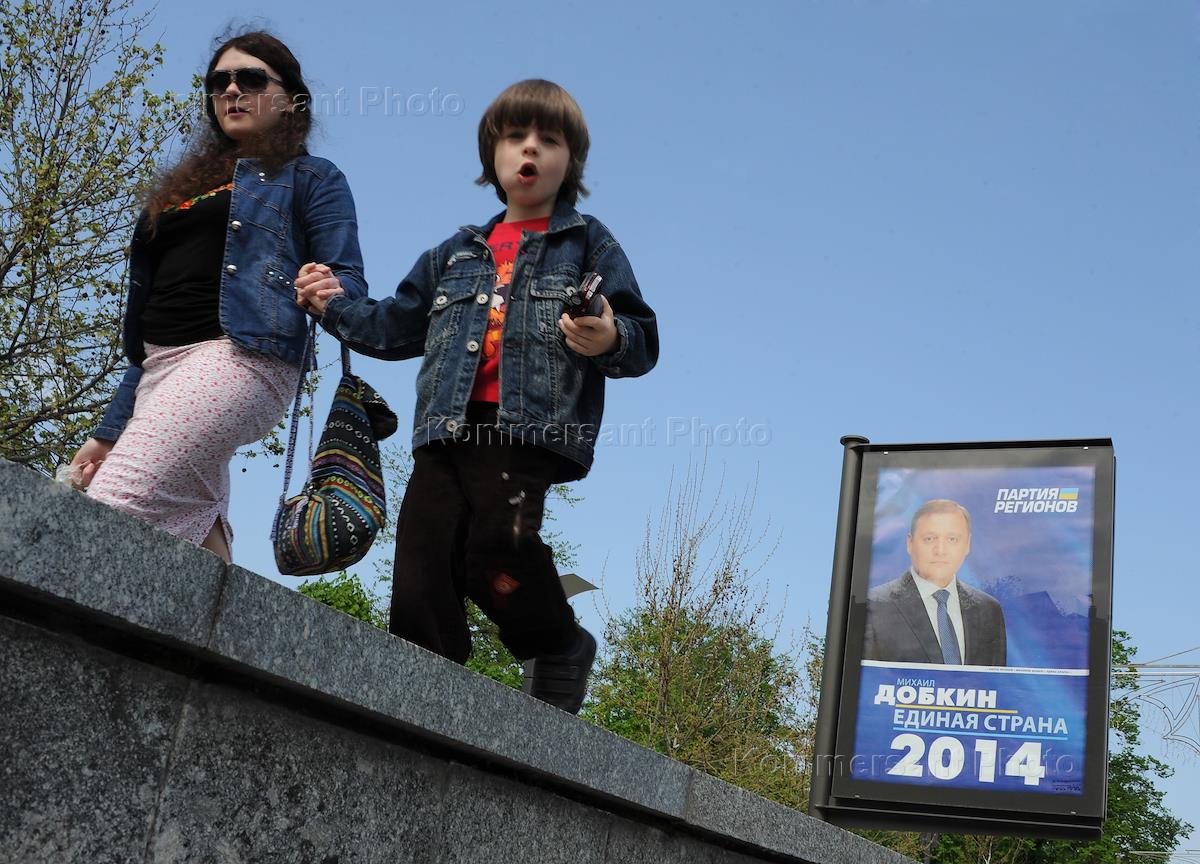 Политическая ситуация на Украине. Виды Днепропетровска. Мужчина наклеивает объявление на столб. Билборд кандидата в президенты Украины Михаила Добкина с надписью "Единая страна".