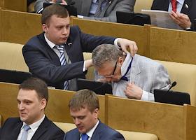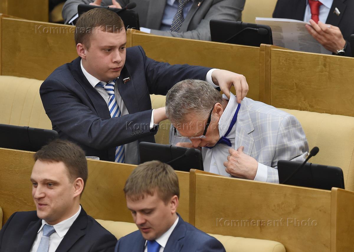 Член комитета Государственной думы (ГД) России по образованию Егор Анисимов (слева) и лидер Либерально-демократической партии России (ЛДПР), член комитета ГД по обороне Владимир Жириновский (справа) во время засединя Госдумы.