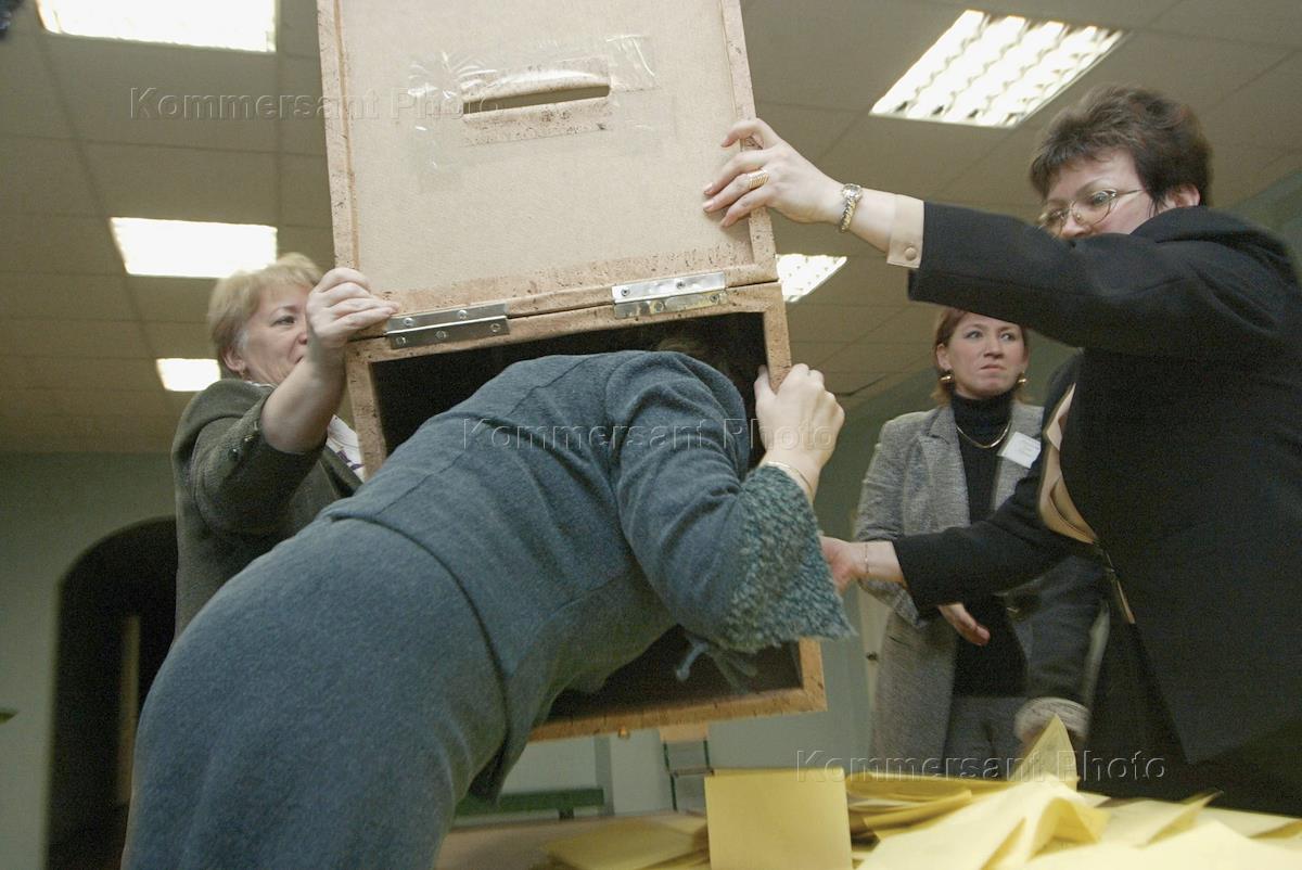 Выборы губернатора Таймыра. Подсчет голосов на избирательном участке. Члены избиркома Таймыра вынимают из урны бюллетени для голосования.