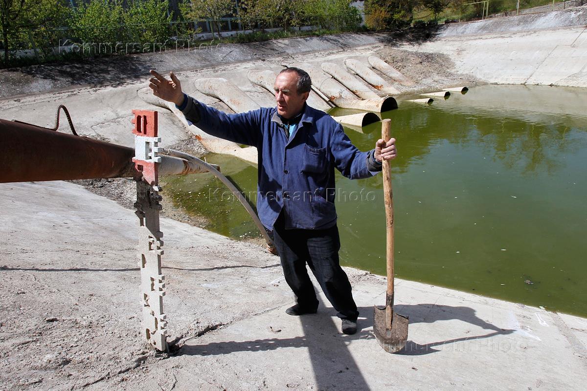 Украина перекрыла шлюзы Северо-Крымского канала, через который вода из реки Днепр поступала на Крымский полуостров. Мужчина набирает остатки воды через шланг.