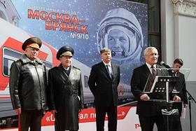 Летчик-космонавт Алексей Леонов (второй слева) на церемонии отправления в первый рейс фирменного поезда № 9/10 сообщением "Москва – Брянск" с Киевского вокзала.
