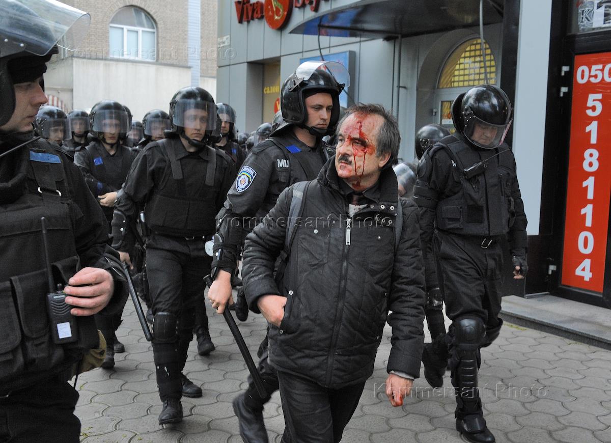 Политическая ситуация на Украине. Пострадавший в результате столкновения между сторонниками федерализации Украины и проукраинскими активистами, которые произошли во время марша "За единую Украину" в Донецке.