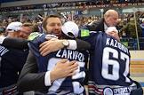 Континентальная хоккейная лига (КХЛ). Кубок Гагарина. Матч финальной серии между командами "Металлург" (Магнитогорск) и "Лев" (Прага). Игроки команды "Металлург" во время церемонии награждения.