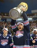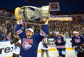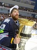 Континентальная хоккейная лига (КХЛ). Кубок Гагарина. Матч финальной серии между командами "Металлург" (Магнитогорск) и "Лев" (Прага). Игрок команды "Металлург" Сергей Мозякин во время церемонии награждения.