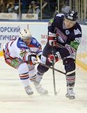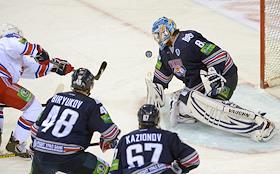 Континентальная хоккейная лига (КХЛ). Кубок Гагарина. Матч финальной серии между командами "Металлург" (Магнитогорск) и "Лев" (Прага). Игрок команды "Металлург" Василий Кошечкин во время матча.