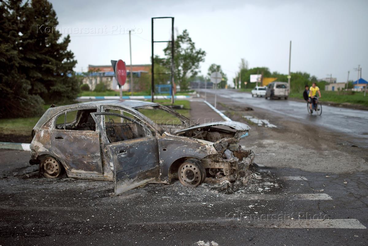 Политическая ситуация на Украине. Автомобиль со следами обстрела откатывают с места происшествия на въезде в Славянск.