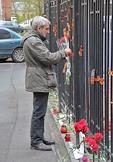 Генеральное консульство Украины на улице Бонч-Бруевича. Цветы и георгиевские ленточки на ограде консульства Украины, принесенные петербуржцами в знак скорби по жертвам противостояния в Одессе. Мужчина повязывает георгиевскую ленточку на ограду консульства.