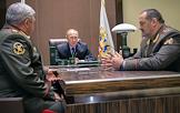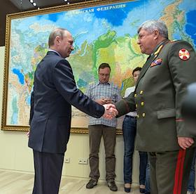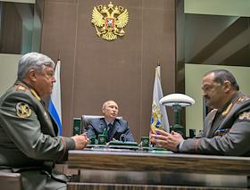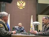 Рабочая поездка президента России Владимира Путина в Сочи. Полномочный представитель президента России в Сибирском федеральном округе главнокомандующий внутренними войсками МВД России Николай Рогожкин (слева), президент России Владимир Путин (в центре) и полномочный представитель в Северо-Кавказском федеральном округе командующий объединенной группировкой внутренних войск МВД России на Северном Кавказе Сергей Меликов (справа) во время встречи с назначенными новыми полномочными представителями президента России. Встреча прошла в резиденции "Бочаров ручей".