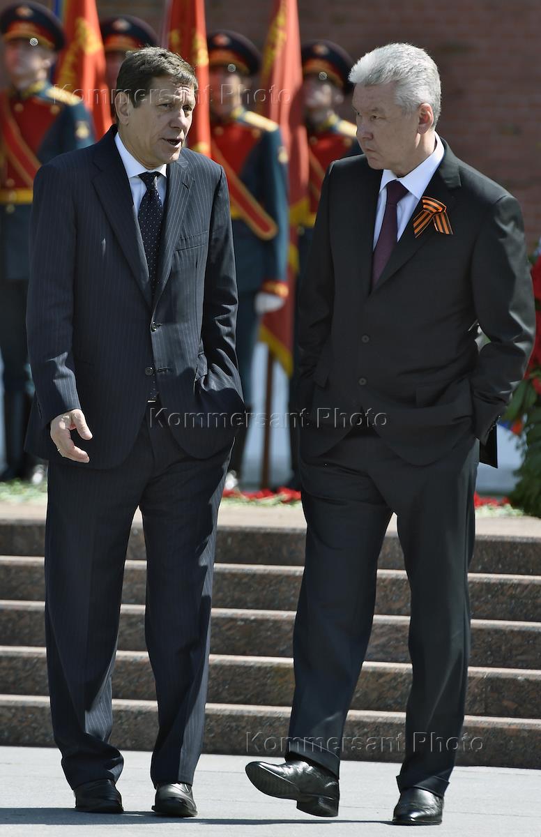 Первый заместитель председателя Государственной думы России Александр Жуков (слева) и мэр Москвы Сергей Собянин (справа) во время церемонии возложения венка и цветов к Могиле Неизвестного Солдата у Кремлевской стены.