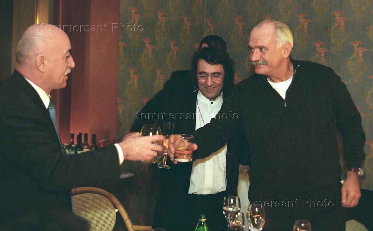 Генеральный директор пивоваренной компании "Балтика" Таймураз Боллоев (слева), председатель союза кинематографистов, кинорежиссер Никита Михалков (справа) на праздничном приеме, посвященном 50-летию альтиста и дирижера Юрия Башмета (в центре). Прием состоялся в особняке Рябушинского.