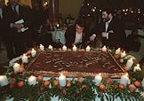 Альтист и дирижер Юрия Башмета (в центре) задувает свечи на праздничном торте во время приема, посвященного его 50-летию. Прием состоялся в особняке Рябушинского.