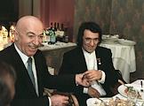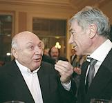 Писатель - сатирик Михаил Жванецкий (слева) и художественный руководитель театра имени Ленинского комсомола Марк Захаров (справа) на праздничном приеме, посвященном 50-летию альтиста и дирижера Юрия Башмета. Прием состоялся в особняке Рябушинского.
