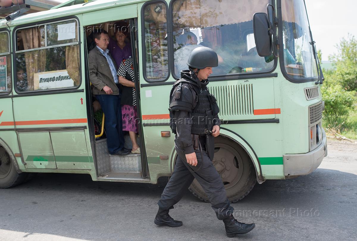 Блок пост украинской армии в поселке Былбасовка под Славянском. Табличка в рейсовом автобусе "Птицефабрика".