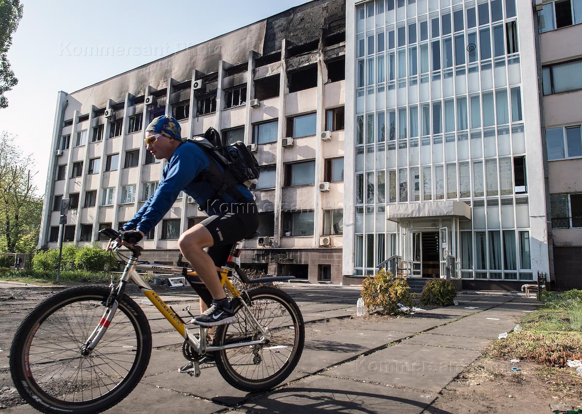 Политичесая ситуация на Украине. Сотрудники милиции Мариуполя вместе с добровольцами дружины Мариупольского металлургического комбината имени Ильича во время патрулирования в городе у сгоревшего здания городского отдела милиции Мариупля.