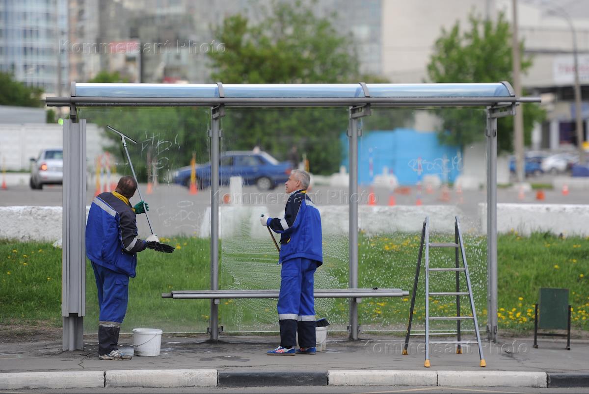 Genre photo. Man walking with his dog on the background of advertising Mosoblbank.