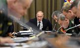 Рабочая поездка президента России Владимира Путина в Сочи. Президент России Владимир Путин (в центре), заместитель председателя правительства России Дмитрий Рогозин (слева) и министр обороны России Сергей Шойгу (справа) во время совещания по вопросам оборонно-промышленного комплекса. Совещание прошло в резиденции "Бочаров ручей".