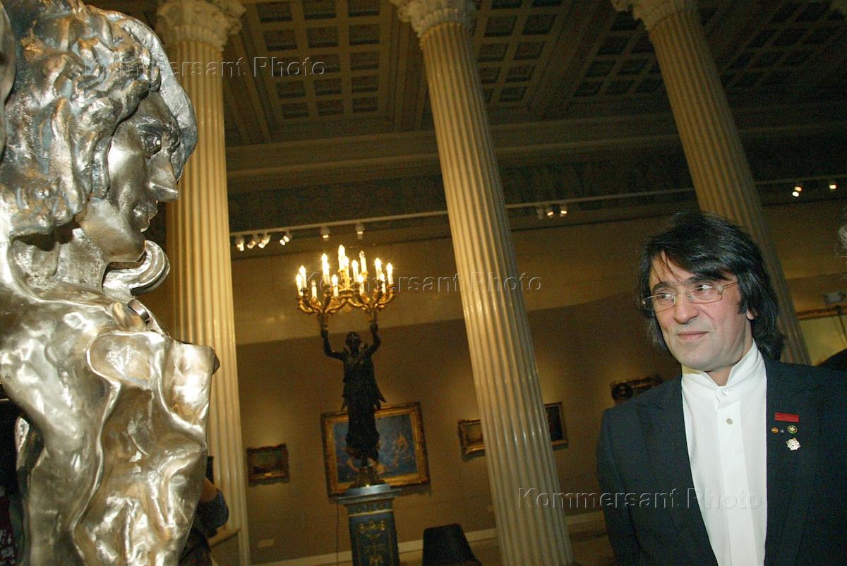 Russian violin player and music conductor Yury Bashmet looks at a broze image of himself created by sculptor Alexander Buganov and presented to Mr Bashmet at the party held to celebrate his 50-th anniversary. The party was held in the Ryabushinsky Mansion.