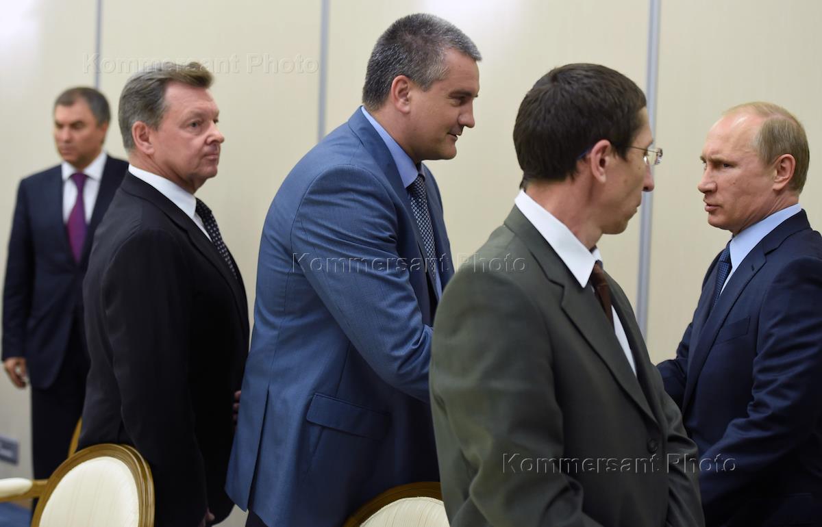 Рабочая поездка президента России Владимира Путина в Сочи. Полномочный представитель президента России в Крымском федеральном округе Олег Белавенцев (слева) и исполняющий обязанности главы Республики Крым Сергей Аксенов (справа) на встрече президента России Владимира Путина с представителями общин крымских татар. Встреча прошла в резиденции "Бочаров ручей".