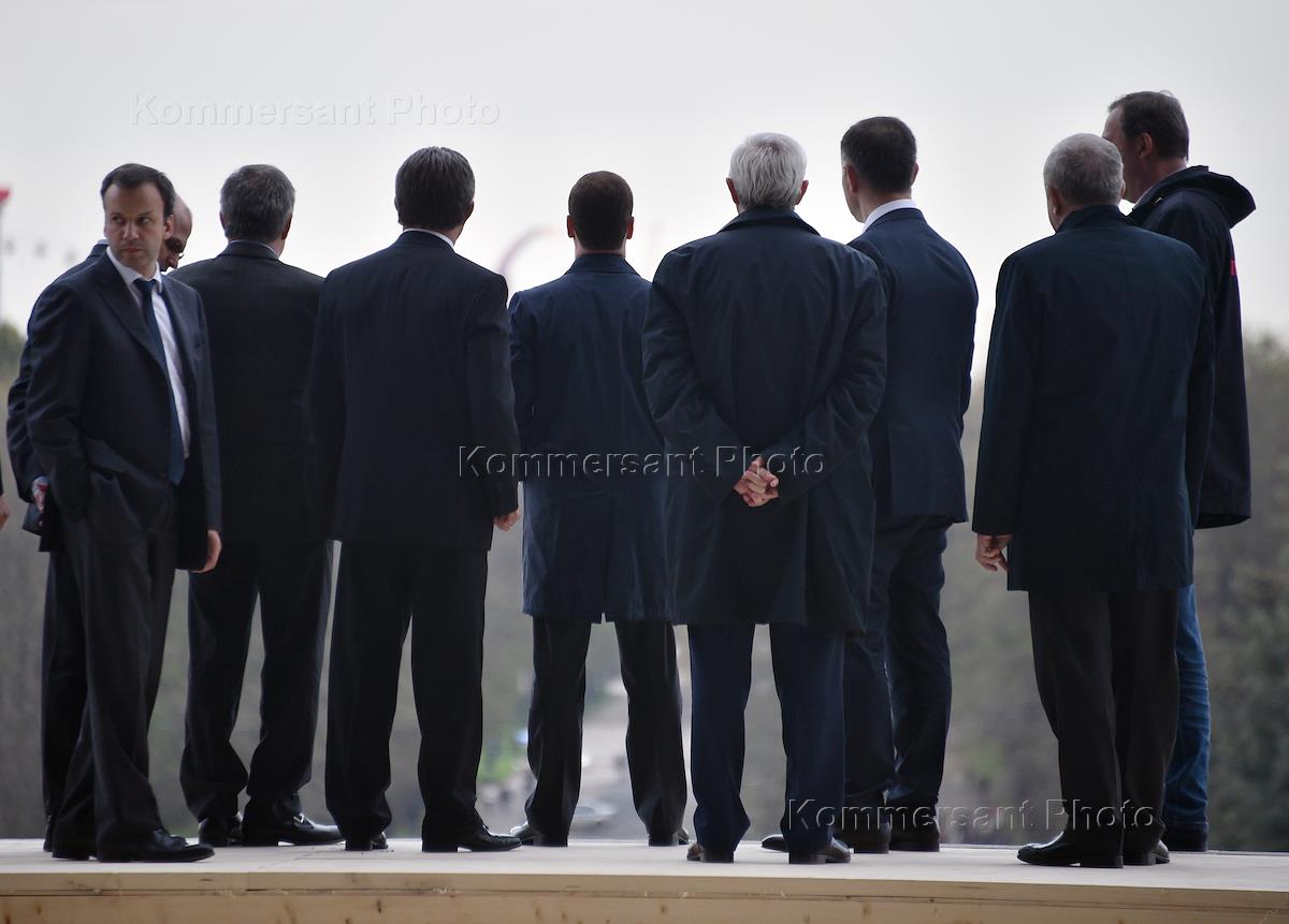 Рабочая поездка председателя правительства России Дмитрия Медведева в Санкт-Петербург. Министр спорта России Виталий Мутко (четвертый справа), председатель правительства России Дмитрий Медведев (третий справа) и губернатор Санкт-Петербурга Георгий Полтавченко (второй справа) во время осмотра строящегося футбольного стадиона на острове Крестовский.