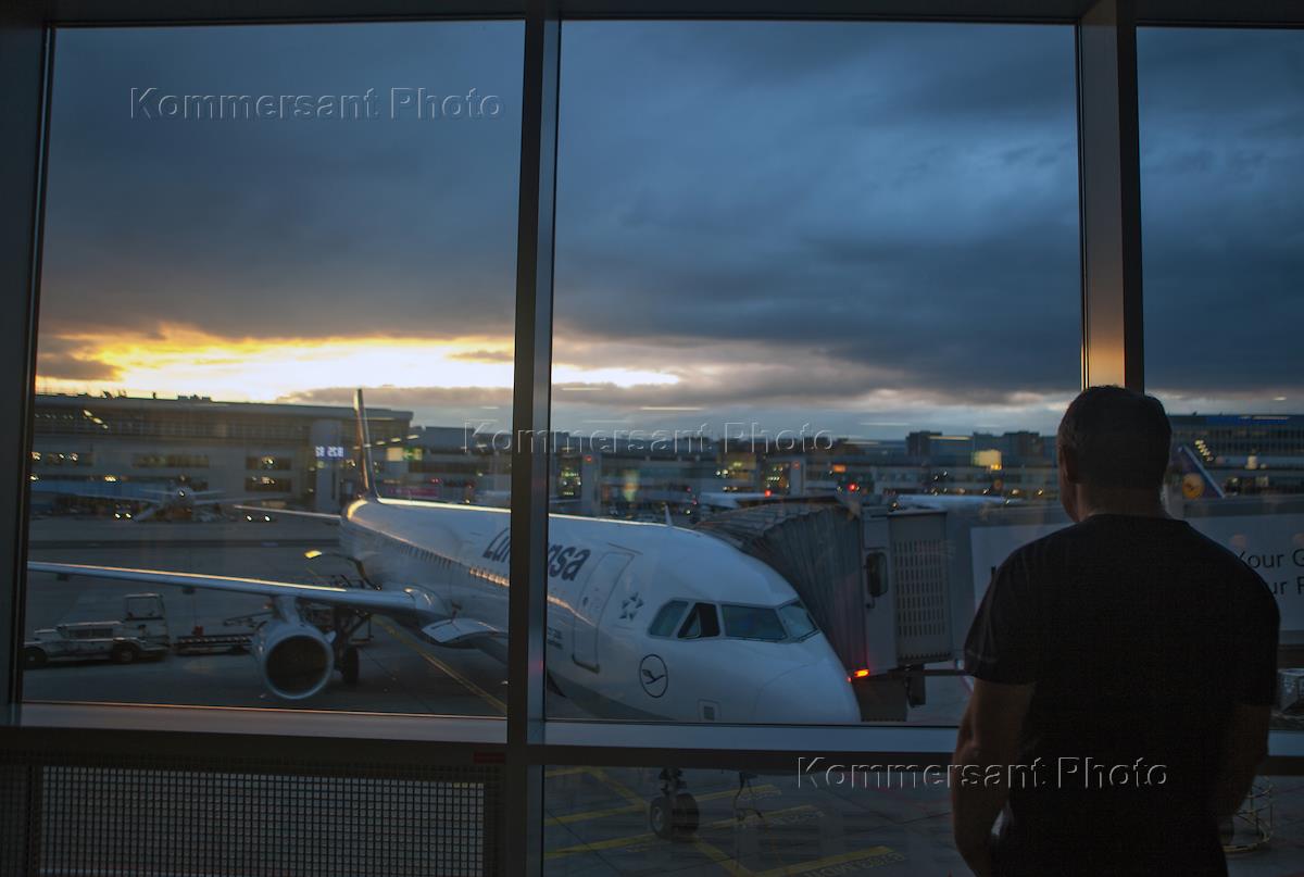 Жанровая фотография. Международный аэропорт Франкфурта-на-Майне. Вид на терминал А. Самолет авиакомпании Lufthansa (Люфтганза) на поле аэропорта.