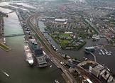 Виды города Амстердам. Улица Piet Heinkade (сверху вниз), научный центр NEMO (справа по центру) и театр BIMHUIS (ближе к центру кадра рядом с лайнером).