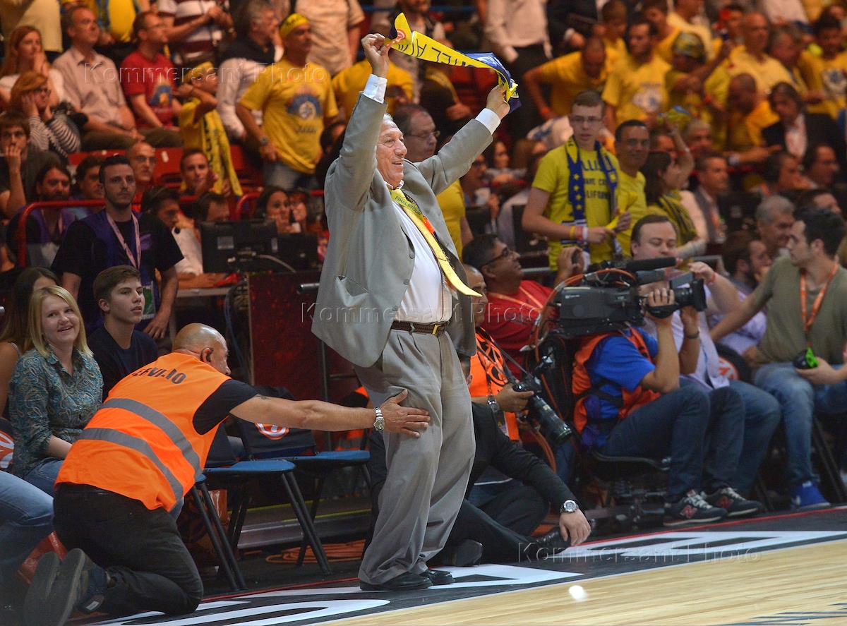 Евролига по баскетболу. Финал четырех. Матч за первое место между командами "Маккаби" (Израиль, Тель-Авив) - "Реал" (Испаиня, Мадрид) на стадионе Mediolanum Forum. Болельщик команда "Маккаби" празднует победу.