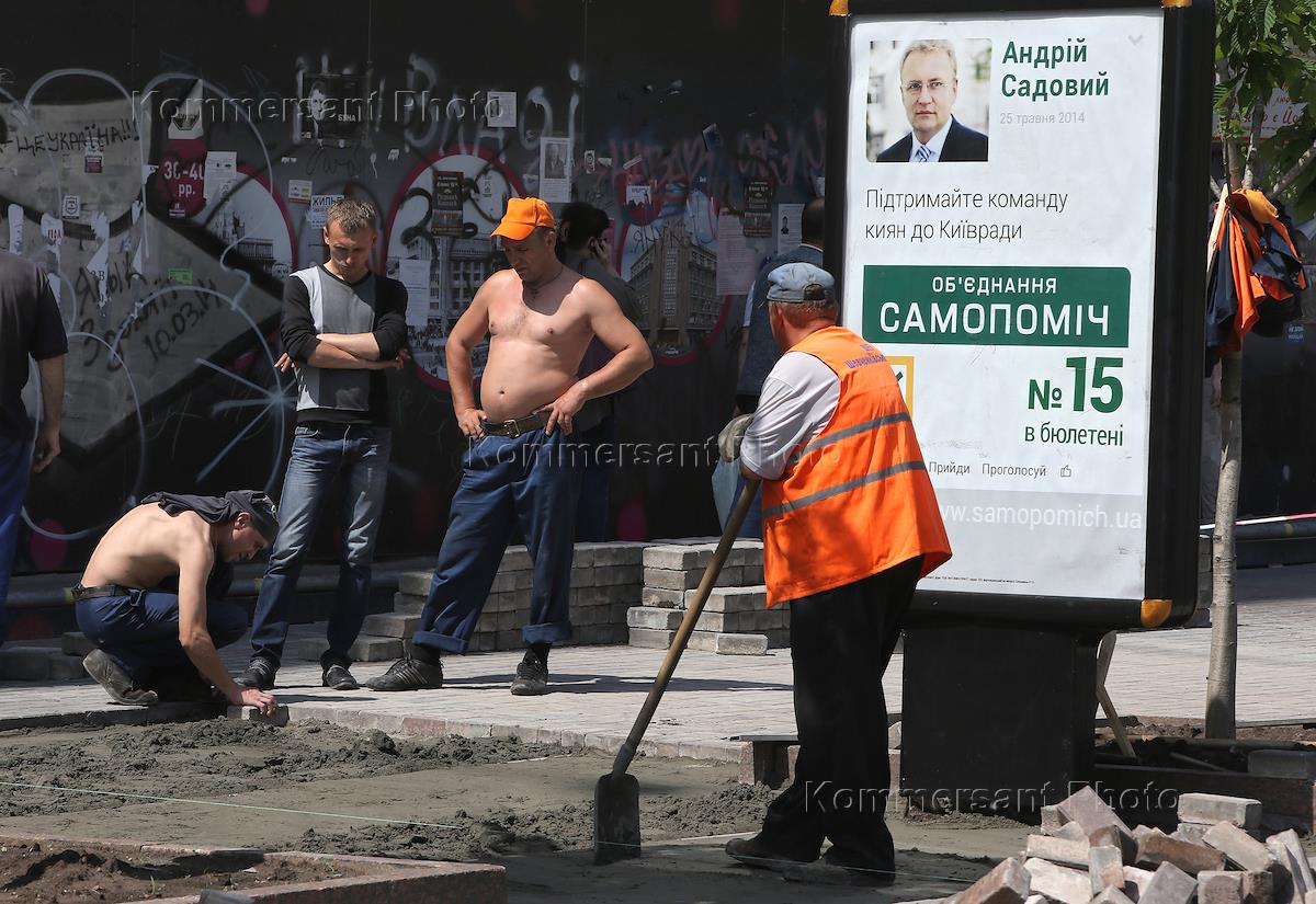 Подготовка к выборам президента Украины. Рекламные билборды с портретом кандидата. Рабочие коммунальных служб города во время ремонта и укладки новой тротуарной плитке на Крещатике.