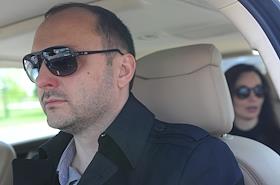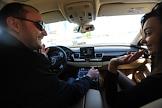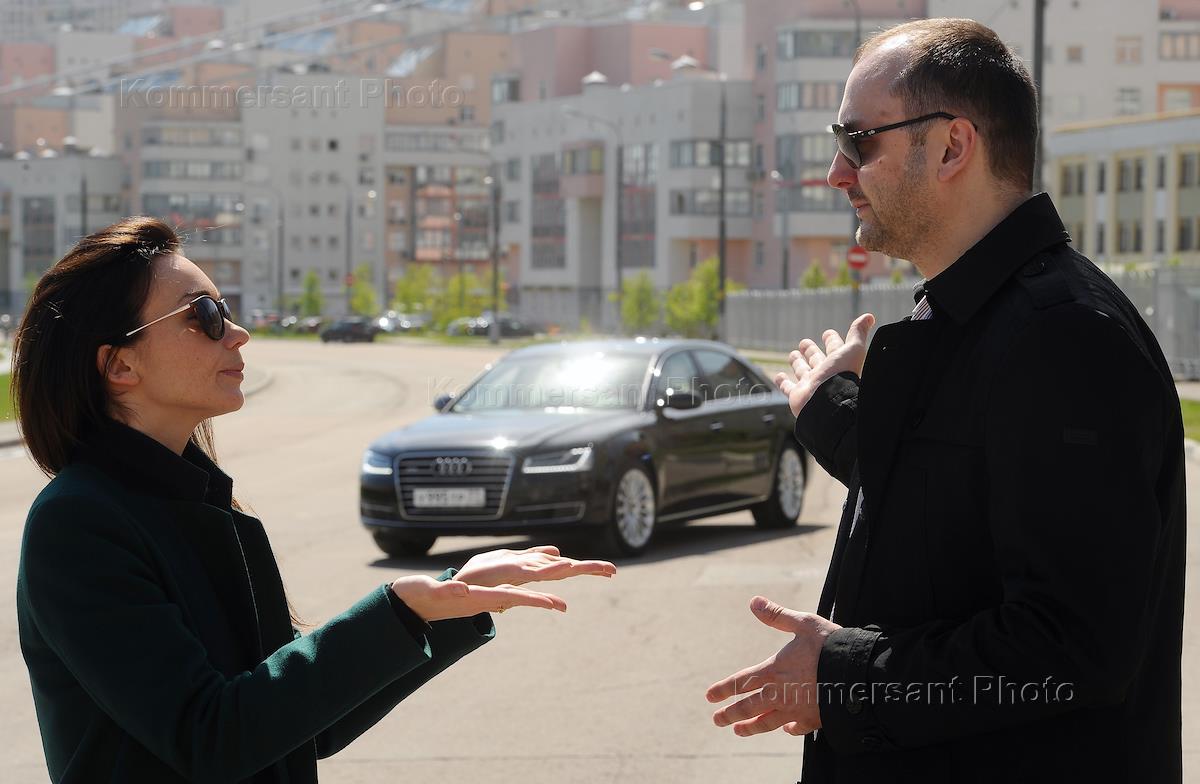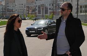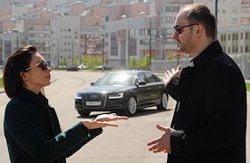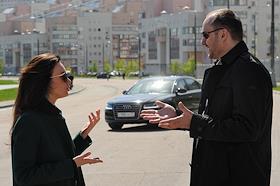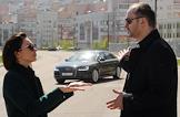 Корреспондент издательского дома (ИД) "Коммерсантъ" Евгения Милова (слева) во время проведения тест-драйва автомобиля Audi A8.