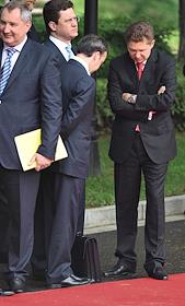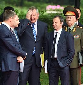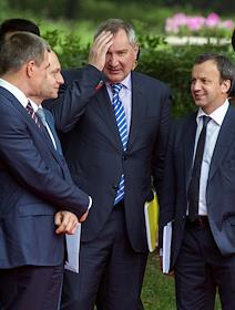Визит президента России Владимира Путина в Китай. Заместитель председателя правительства России Дмитрий Рогозин (в центре) и заместитель председателя правительства России Аркадий Дворкович (второй справа) перед началом церемонии официальной встречи в государственной резиденции "Сицзяо" в Шанхае.