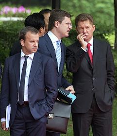 Визит президента России Владимира Путина в Китай. Слева направо: заместитель председателя правительства России Аркадий Дворкович, министр энергетики России Александр Новак и председатель правления ОАО "Газпром" Алексей Миллер перед началом церемонии официальной встречи в государственной резиденции "Сицзяо" в Шанхае.