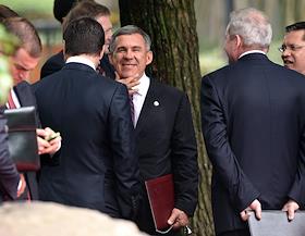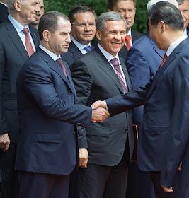 Визит президента России Владимира Путина в Китай. Слева направо: губернатор Пермского края Виктор Басаргин, президент Башкирии Рустэм Хамитов, полномочный представитель президента в Приволжском федеральном округе Михаил Бабич, президент Республики Татарстан Рустам Минниханов, губернатор Санкт-Петербурга Георгий Полтавченко перед началом церемонии официальной встречи в государственной резиденции "Сицзяо" в Шанхае.