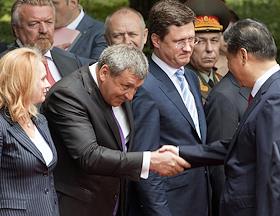 Визит президента России Владимира Путина в Китай. Слева направо: председатель российской части российско-китайского делового совета, владелец инвестиционной группы Volga Group Геннадий Тимченко, полномочный представитель президента в Приволжском федеральном округе Михаил Бабич, заместитель министра экономического развития России Алексей Лихачев, президент Республики Татарстан Рустам Минниханов, председатель правления ОАО "Газпром" Алексей Миллер и председатель Китайской народной республики Си Цзиньпин во время церемонии официальной встречи в государственной резиденции "Сицзяо" в Шанхае.