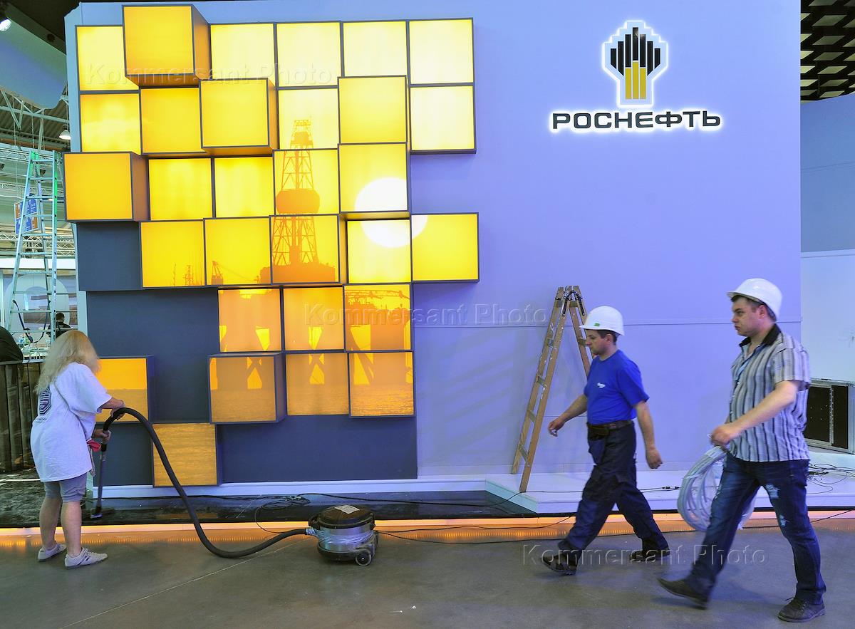 XVIII Петербургский Международный экономический форум(ПМЭФ) в выставочном комплексе "Ленэкспо". Монтаж оборудования для форума. Жанровая фотография.