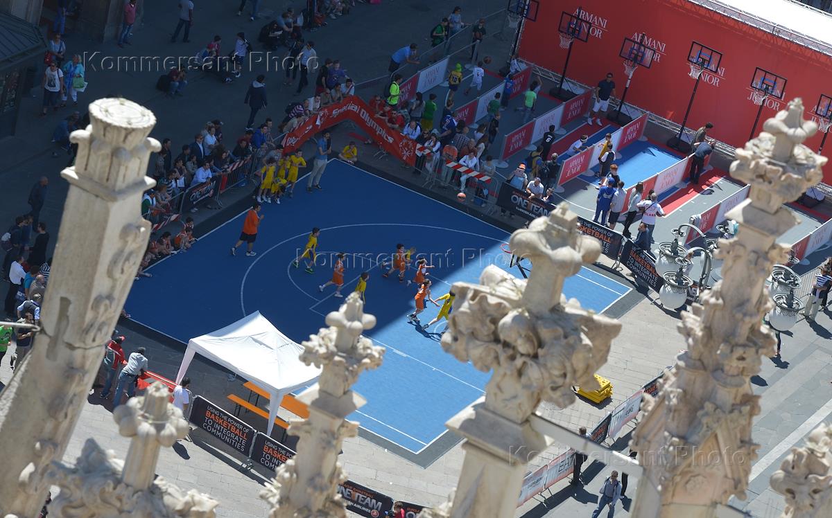 Виды Милана с крыши Миланского кафедрального собора (Duomo di Milano). Дети играют в баскетбол на площади.